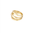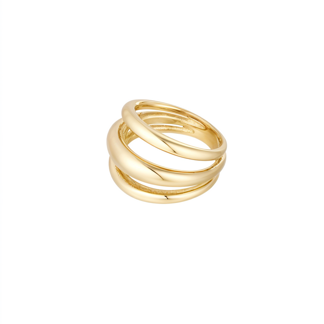 The Castle ring captivates with its bold design, featuring three interwoven bands that create a harmonious layered effect. Its golden shine and generous curves make it a statement piece, perfect for enhancing every movement.